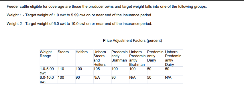 Coverage prices are based off of CME Feeder Cattle Futures. This is the price adjustment factors used to get coverage prices.